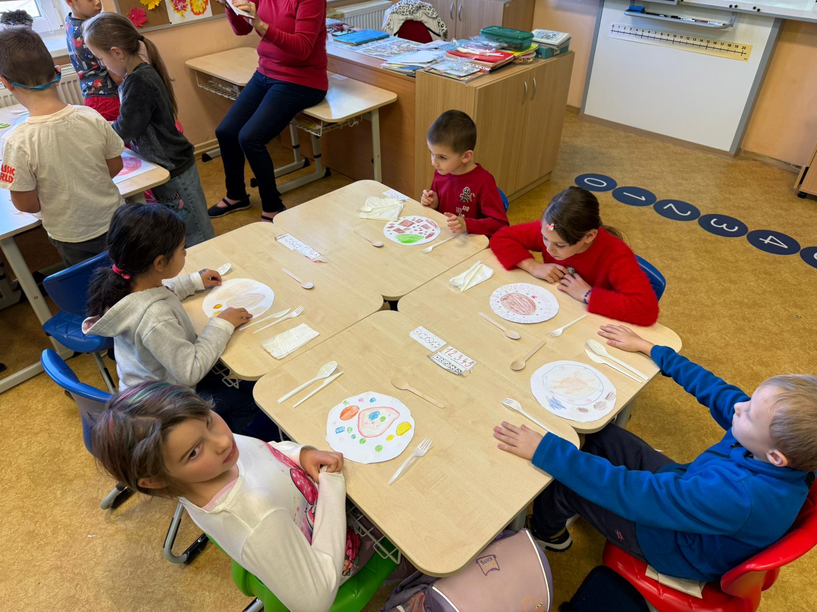 Dnes jsme během pracovních činností zkusili prostřít stůl k obědu podle pravidel etikety. Všechny děti to zaujalo, sdílely své zkušenosti s návštěvou restaurace nebo se slavnostním stolováním. Vlastnoručně namalované pokrmy nám doplnily atmosféru a s chutí jsme po zvonění zamířili do školní jídelny na oběd.