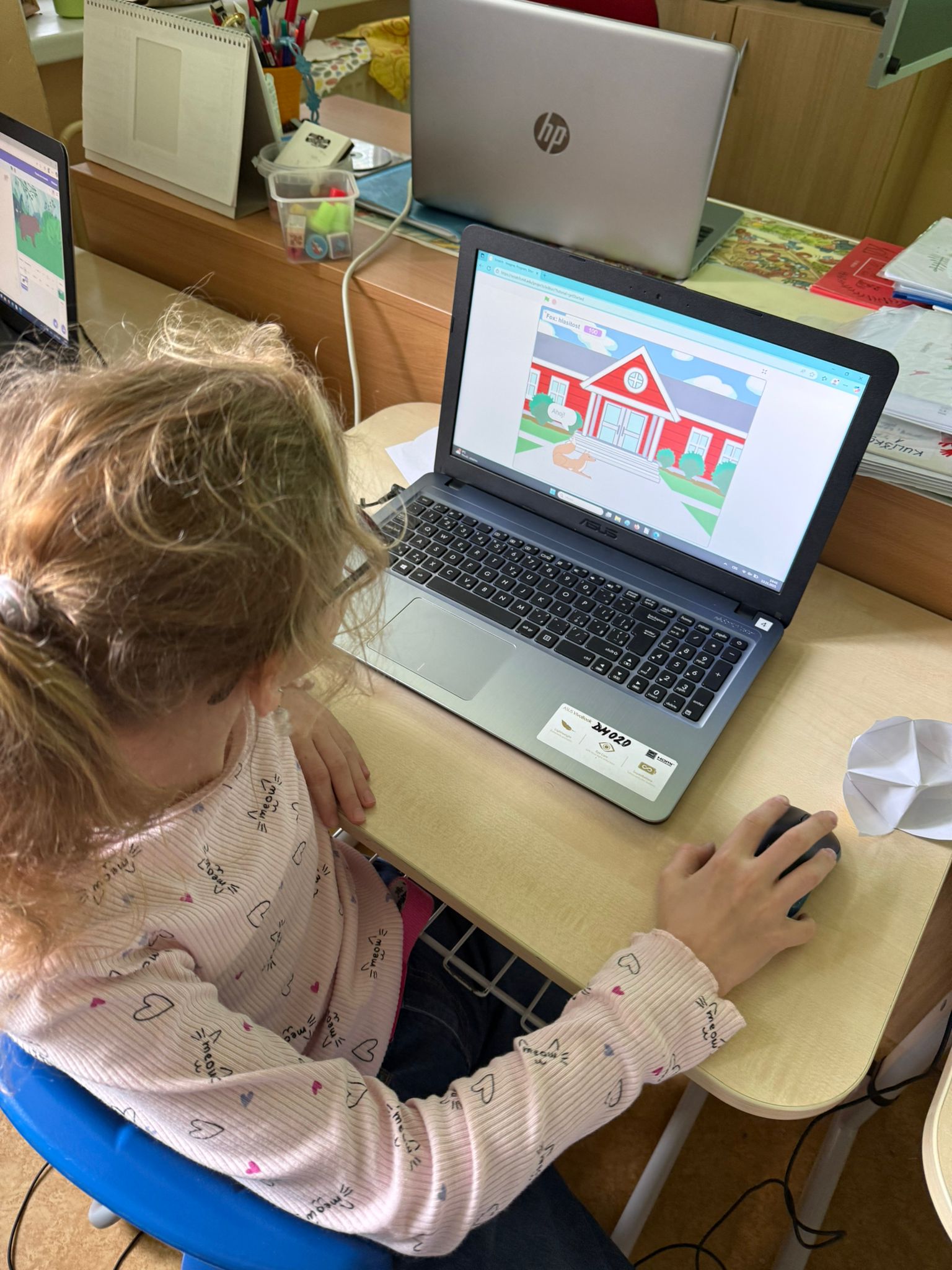 Dne 13. listopadu 2025 se konal kroužek programování, kde si děti vyzkoušely práci se Scratchi – programem, který umožňuje vytvářet vlastní animace a interaktivní příběhy. Dnes se učily, jak přidávat pozadí a zvuky a také, jak postavu ovládat tak, aby se hýbala přesně podle jejich pokynů. Podle předlohy děti vytvářely krátké a vtipné skeče, při kterých mohly uplatnit svou fantazii a kreativitu. Ti, kdo chtěli, měli možnost předvést své výtvory spolužákům, což přineslo spoustu smíchu a nadšení.