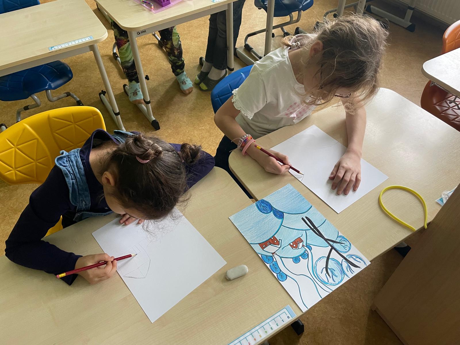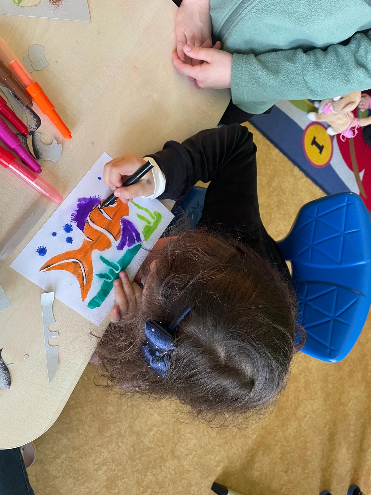 Další aktivitou bylo vytváření obrázků pomocí foukacích fix, při kterém děti experimentovaly s barvami a tvary. Vznikly zajímavé a nápadité výtvarné práce podporující dětskou fantazii a tvořivost.